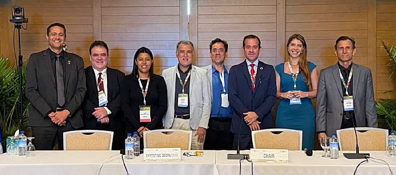 Foto: Parte da delegação brasileira durante uma das plenárias na CITEL. Da Esq. para Dir.: Tarcísio Bakaus (Anatel), Flávio Archangelo (LABRE/IARU), Kim Mota (Anatel), Sydney Nince (Anatel), Sérgio Maia (Hughes/Abrasat), Vinícius Caram (Anatel), Luciana Ferreira (Anatel), Luís Giffoni (MC).  (Créditos: CITEL)